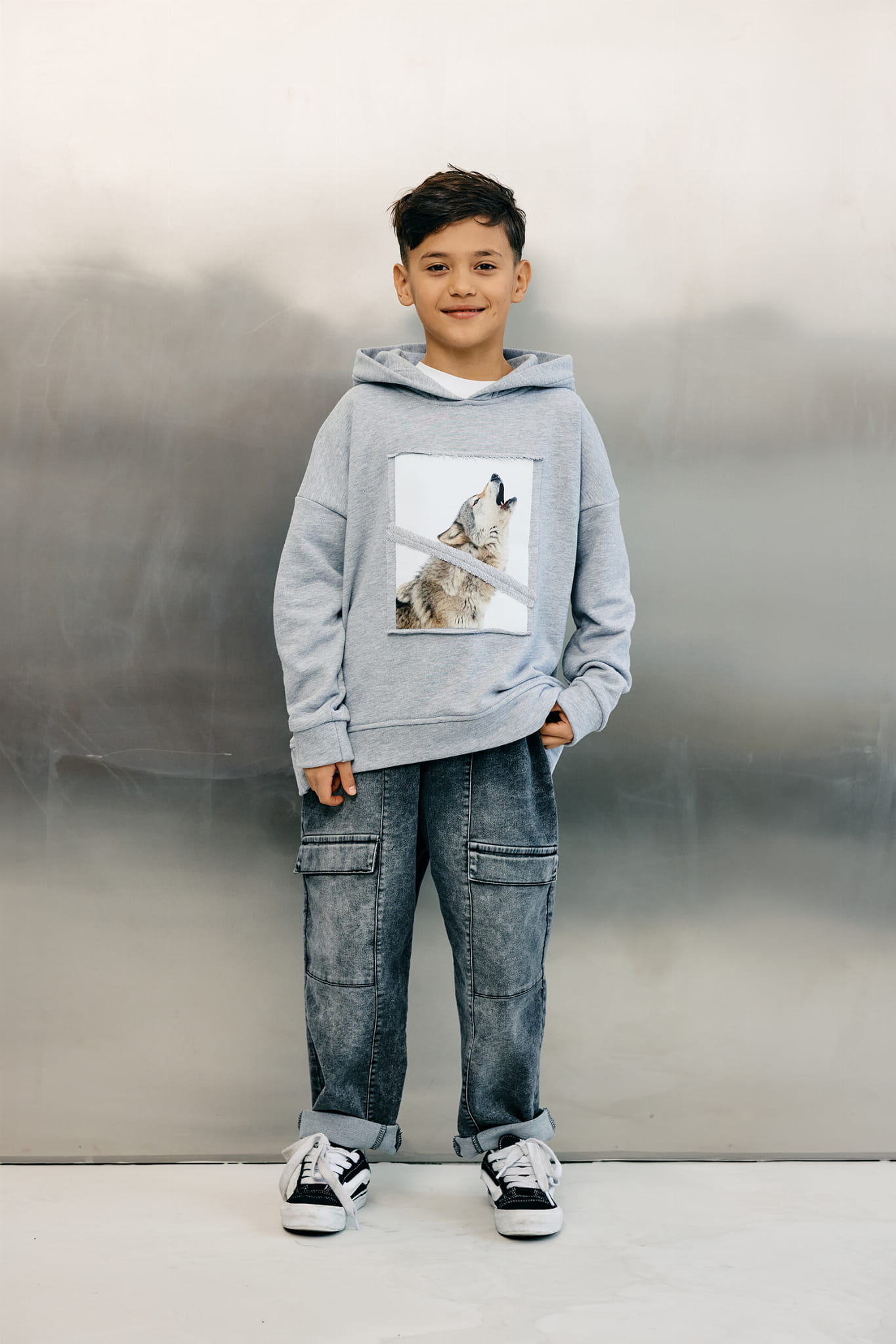 MashMnie SHADOW WOLF dziecięca bluza dresowa z kapturem szara